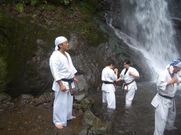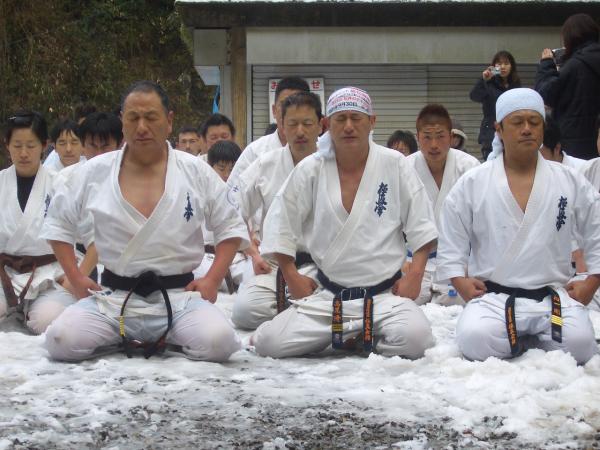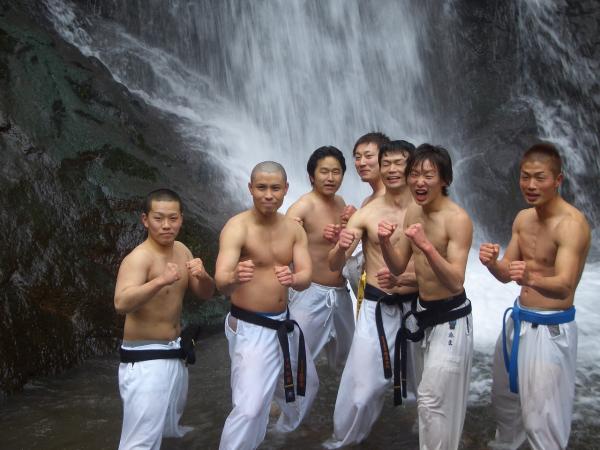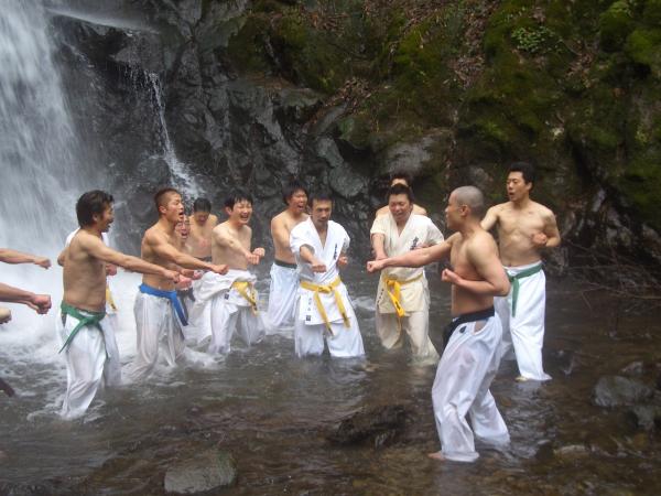 今回 平成20年2月3日 4年ぶりに一乗滝での寒稽古に開催されました。 各一般道場生のみの参加となったが、40名程度の道場生が雪降る極寒の中 例年に無く水量の多い滝壺の中、気合諸共入水し、基本の手技・足技を行い 久しぶりの滝の冷たさ・痛さに発奮して寒稽古を行いました。 YA−−−