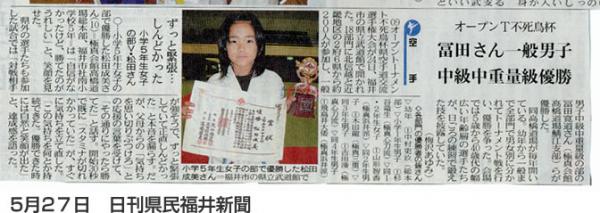 5月24日の不死鳥杯の大会が、5月26日付けの福井新聞と27日の日刊県民福井にて掲載されました。 また、同じく27日の日刊県民福井にて、鯖江支部の紹介が掲載されました。