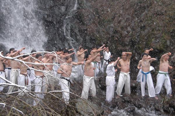 2月13日(日)福井市浄教寺町・一乗滝にて、恒例、一般部寒稽古が行われました。今年は、大雪にみまわれ、一乗滝では1メートル以上の積雪がありました。滝までの数百メートルの道のりを踏み固めながら滝に向かい、まず基本稽古から始まりました。次に法の演武が行われ、松田、野坂指導員による最破の型、試割を行い、続いて演武の最後は、飯田師範代、渡辺支部長による三戦の型、瓦割りで締めくくりました。最後は、全員で滝壺に入り、部位鍛錬と改めて基本稽古を行いました。例年よりも厳しい寒さの中、より一層一人一人が身を引き締められる寒稽古となりました。