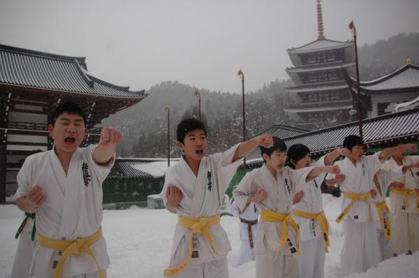 1月6日、勝山市越前大仏において、毎年恒例の寒稽古が行われました。 当日は新雪と雪の降る中、下は4歳から上は74歳まで、約180名が一年の武道の精進を誓いました。 高橋主席師範、力強い突きをありがとうございました。