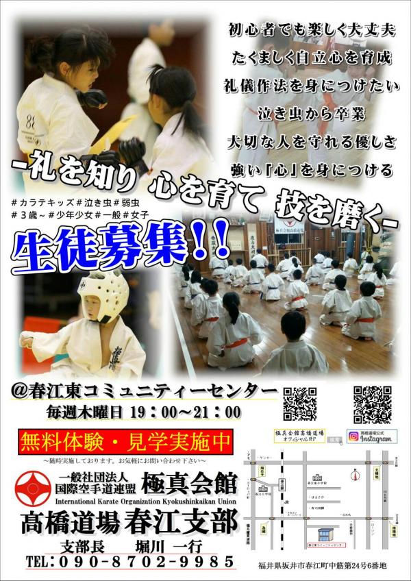来月2月より春江支部を新規開設します。 只今生徒募集中です! 無料体験・見学を随時実施中です。どうお気軽にお問い合わせください。 <春江支部> 日時:毎週木曜日 19:00~21:00 場所:春江東コミュニティセンター 支部長:堀川一行