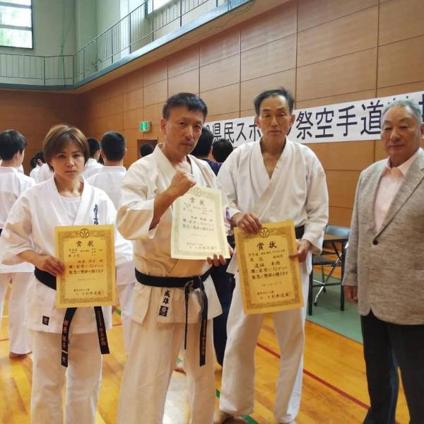 7月7日(日)、全空連空手の大会、福井県民スポーツ祭大会が開催されました。 飯田成雄が優勝、柳原洋子が二位、道坂卓永さんが特別敢闘賞を授与されました。 日頃から指導していただいた高橋主席師範、伝統派空手の上坂先生ありがとうございました。