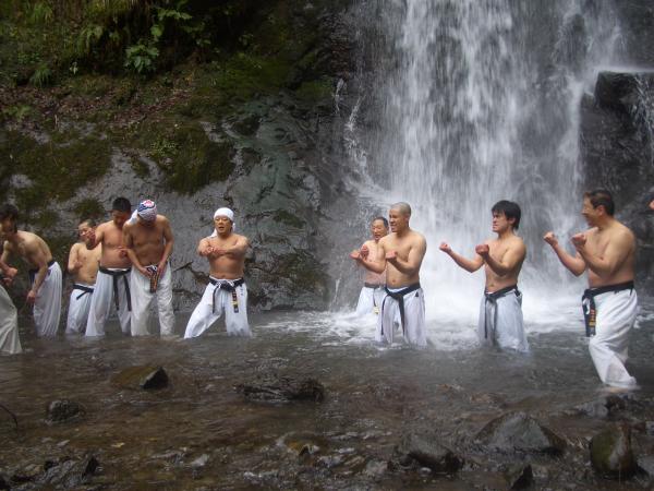今回 平成20年2月3日 4年ぶりに一乗滝での寒稽古に開催されました。 各一般道場生のみの参加となったが、40名程度の道場生が雪降る極寒の中 例年に無く水量の多い滝壺の中、気合諸共入水し、基本の手技・足技を行い 久しぶりの滝の冷たさ・痛さに発奮して寒稽古を行いました。 YA−−−