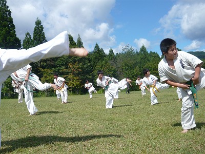 前日までの雨がうそのように晴れ上がり太陽照り付ける芝生の上で、組手強化稽古及び、上級者による高橋師範直々のサイ稽古を、汗だくになり練習しました。